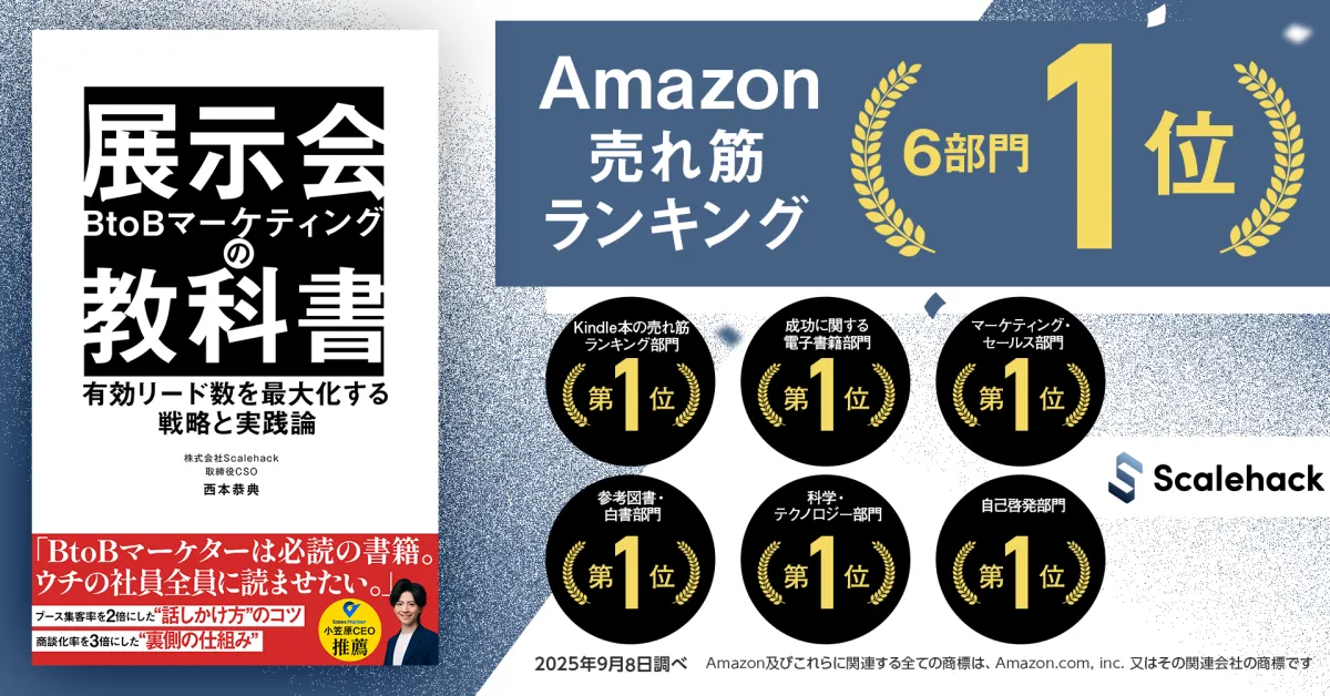 株式会社Scalehackの取締役CSO西本恭典が執筆した書籍『展示会BtoBマーケティングの教科書 ― 有効リード数を最大化する戦略と実践論』が、発売間もなくしてAmazonの売れ筋ランキングで6つの部門において1位を獲得しました。展示会をビジネスの収益源に変えるための具体的な戦略と実践が紹介されている本書。特に展示会や営業、マーケティングに携わるビジネスパーソンに向けて書かれており、非常に注目を集めています。