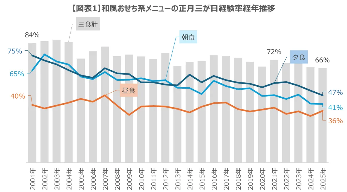 朝食や夕食では長期的に減少傾向にあるものの、昼食では比較的安定しているため、伝統的な日本のおせち文化はまだまだ健在なのです。