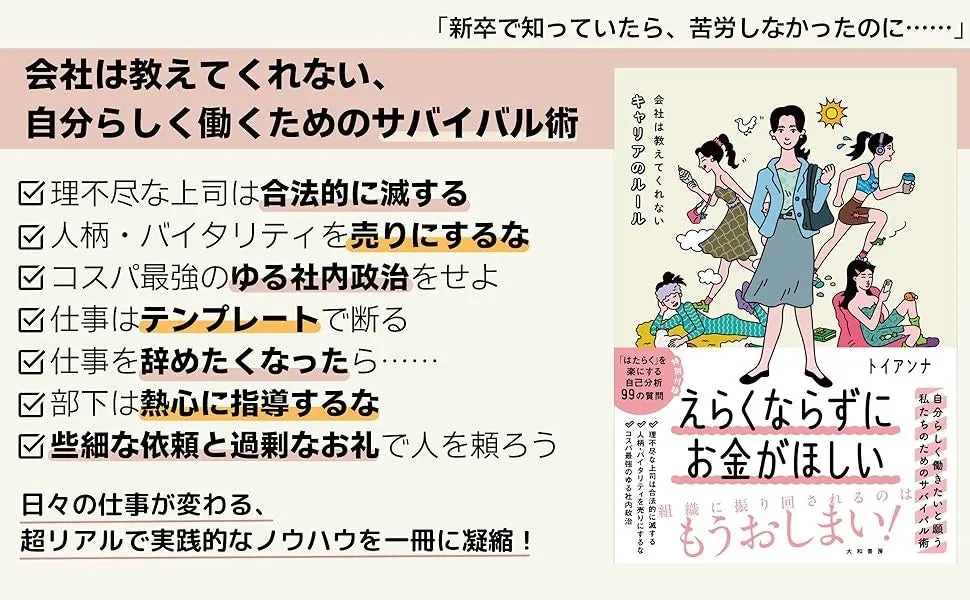 株式会社大和書房から、トイアンナ著の新刊『えらくならずにお金がほしい 会社は教えてくれないキャリアのルール』が2025年2月22日に発売されます。この本は、自分らしく働きたいと考える人々に向けて、現実的で実践的なサポートを提供する一冊です。