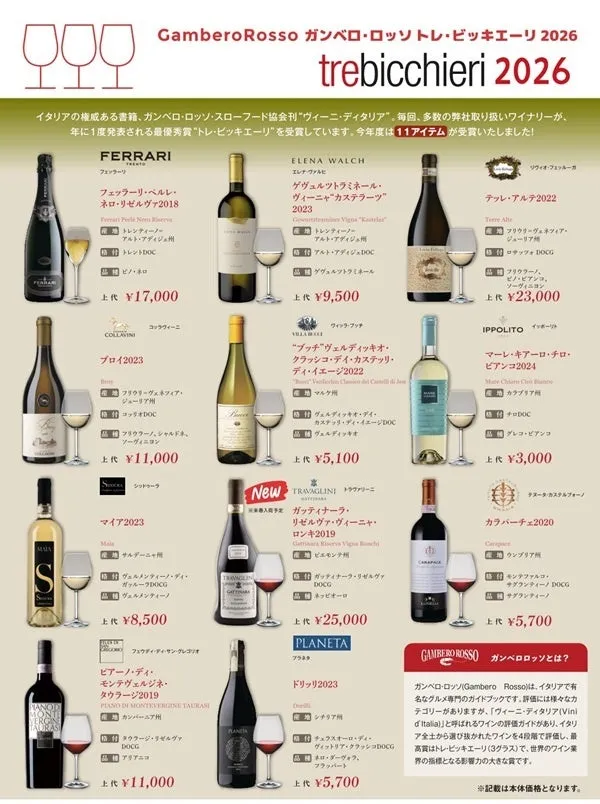 日欧商事株式会社が輸入するイタリアワインの中から、なんと11アイテムがガンベロロッソの権威あるワインガイド『ヴィーニ・ディタリア(2026年度版)』で最高評価の「トレ・ビッキエーリ」(=3グラス)を獲得しました。この評価は、イタリア国内外のワイン業界における大きな信用と信頼を象徴しています。