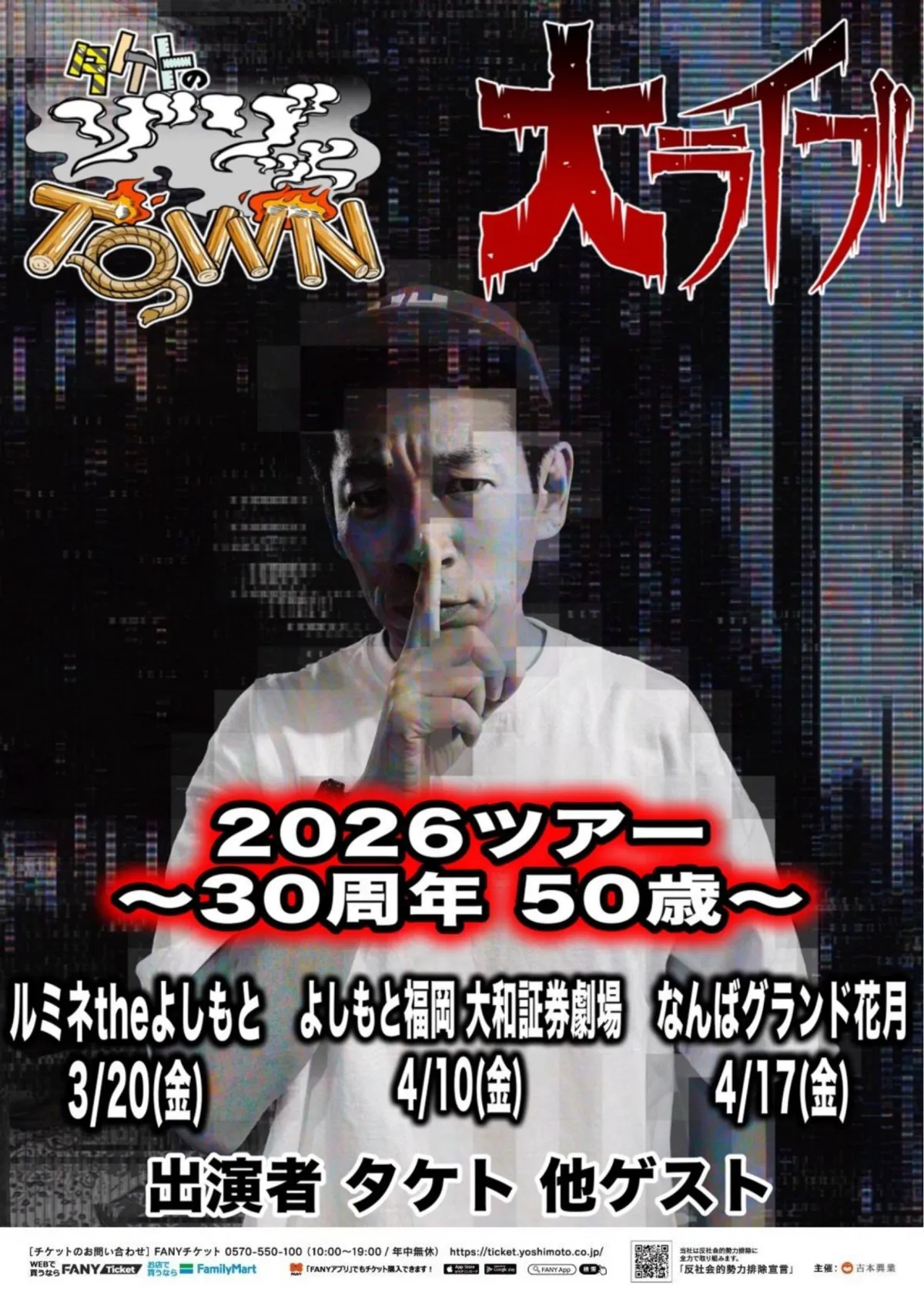 タケトのYouTubeチャンネル「タケトのゾゾッとTOWN」による待望のライブイベント『ゾゾッとTOWN大ライブ2026ツアー ~30周年50歳~』が、2026年3月から4月にかけて全国の主要3都市で開催されることが正式に発表されました。このツアーは、タケトの芸人としての30周年と自身の50歳という特別な節目を祝うもので、多くのファンが聞き逃せない内容となっています。