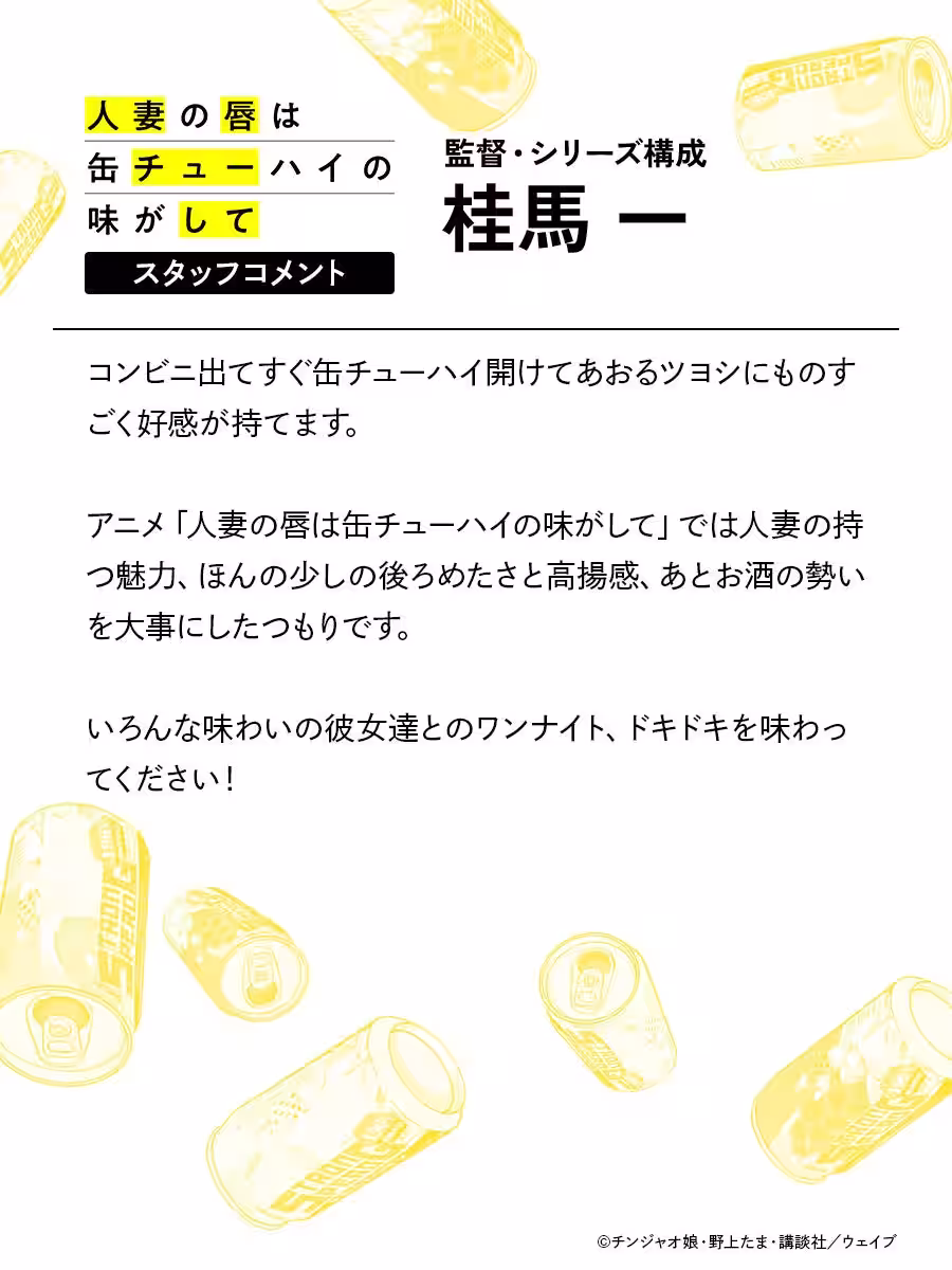 アニメのメインキービジュアルも公開され、このビジュアルでは特に人気の人妻ヒロイン、郡山結が手にした缶チューハイに主人公のツヨシが描かれています。これからどんなヒロインたちが登場するのか、原作コミックでは既に27名以上の様々な人妻が登場しており、アニメでの展開が今から楽しみです。