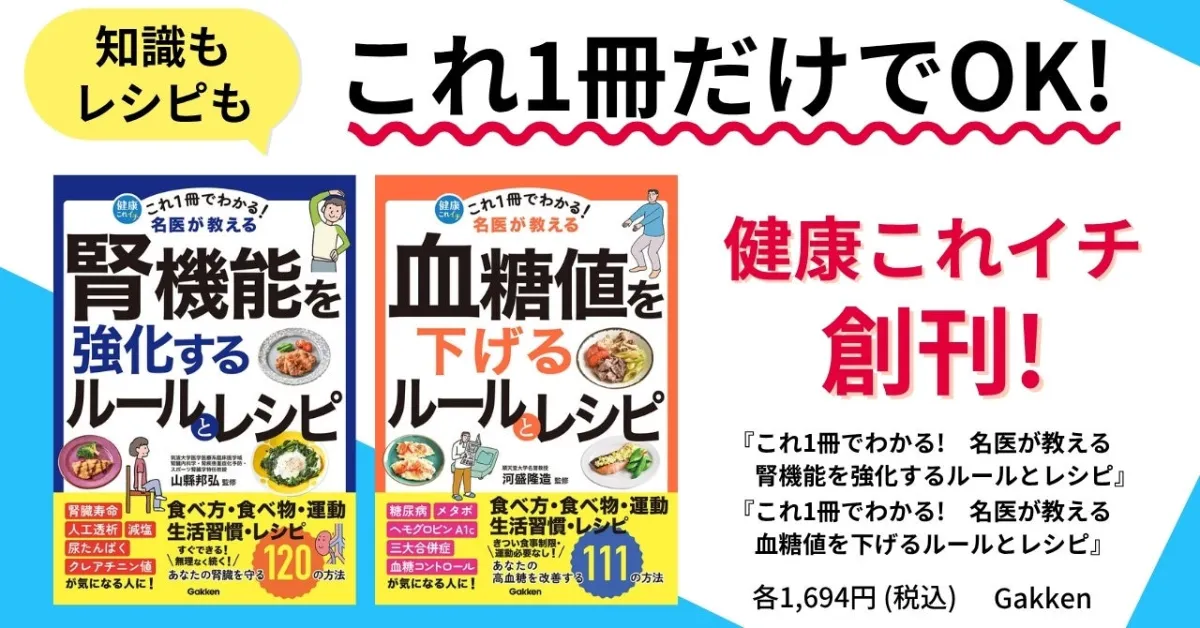 2025年6月30日、株式会社Gakkenから新しい健康実用書「健康これイチ」シリーズが創刊されました。初回として発売されたのは、腎機能の強化と血糖値を下げるための2冊。「これ1冊でわかる!名医が教える腎機能を強化するルールとレシピ」と「これ1冊でわかる!名医が教える血糖値を下げるルールとレシピ」の2冊です。