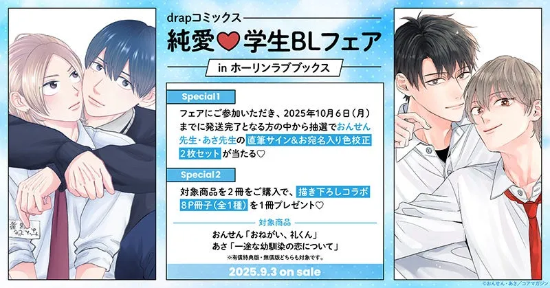新たなBLファンの皆さんに朗報です!株式会社TORICOが運営するホーリンラブブックスにて、今年の8月から10月の間に「drapコミックス 純愛♡学生BLフェア」が開催されます。このフェアは、おんせん先生の『おねがい、礼くん』とあさ先生の『一途な幼馴染の恋について』の発売を記念して行われ、豪華な特典が用意されています。
