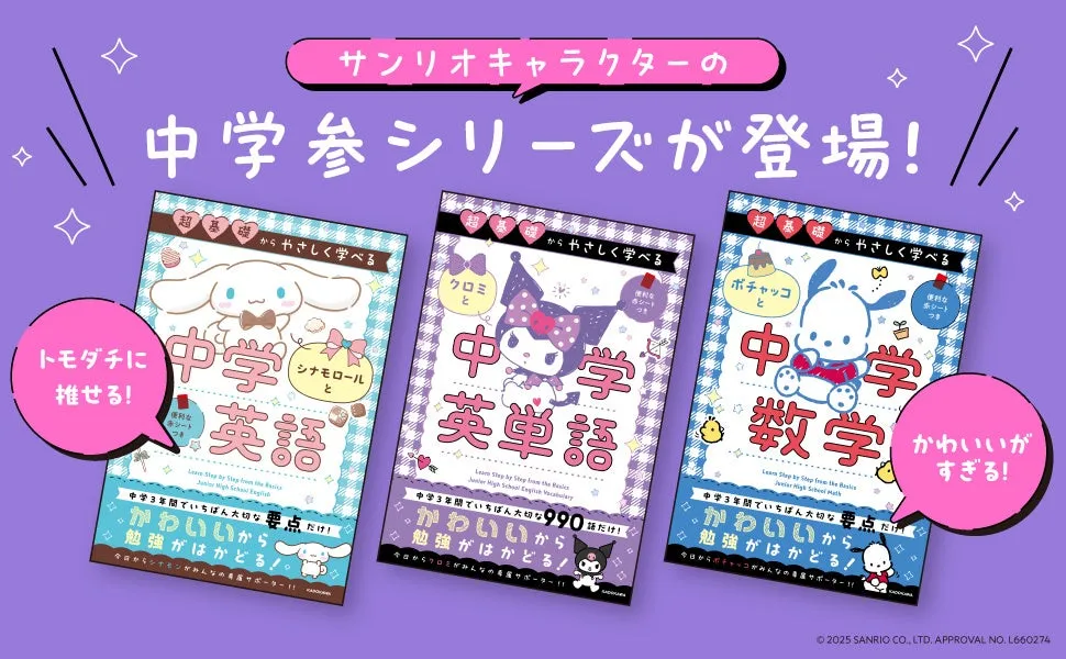 株式会社KADOKAWAは、2025年5月2日(金)に新たな中学参考書シリーズを発売します。タイトルは『超基礎からやさしく学べる クロミと中学英単語』『超基礎からやさしく学べる シナモロールと中学英語』『超基礎からやさしく学べる ポチャッコと中学数学』の3冊で、いずれも京進の監修のもと作成されています。これらの参考書は、楽しいサンリオキャラクターたちと一緒に学びながら、英語や数学の重要な内容を短時間でおさらいできるという特長を持っています。