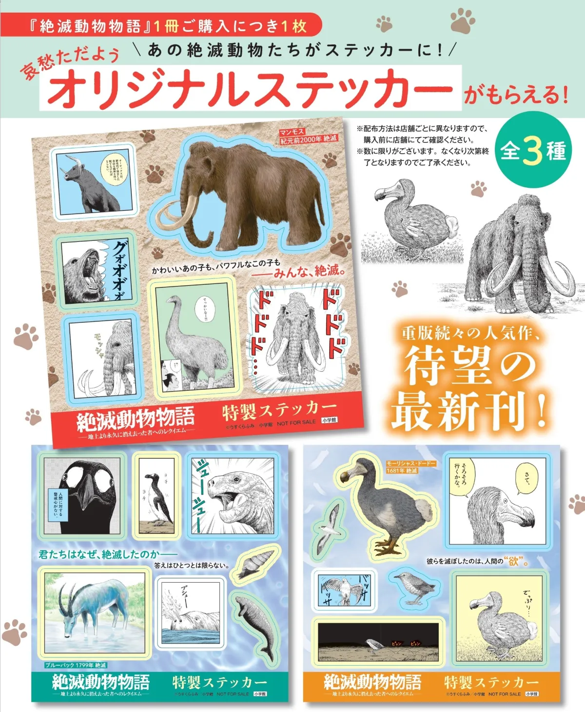 第3集の発売を記念して、全3種の特製ステッカーがもらえるノベルティフェアが全国の対象書店で開催される。このステッカーには、漫画に登場する絶滅動物たちの可愛らしい姿がデザインされており、その哀愁漂う世界観を存分に楽しむことができる。これらのステッカーは、フェア参加書店でしか入手できない貴重なアイテムだ。