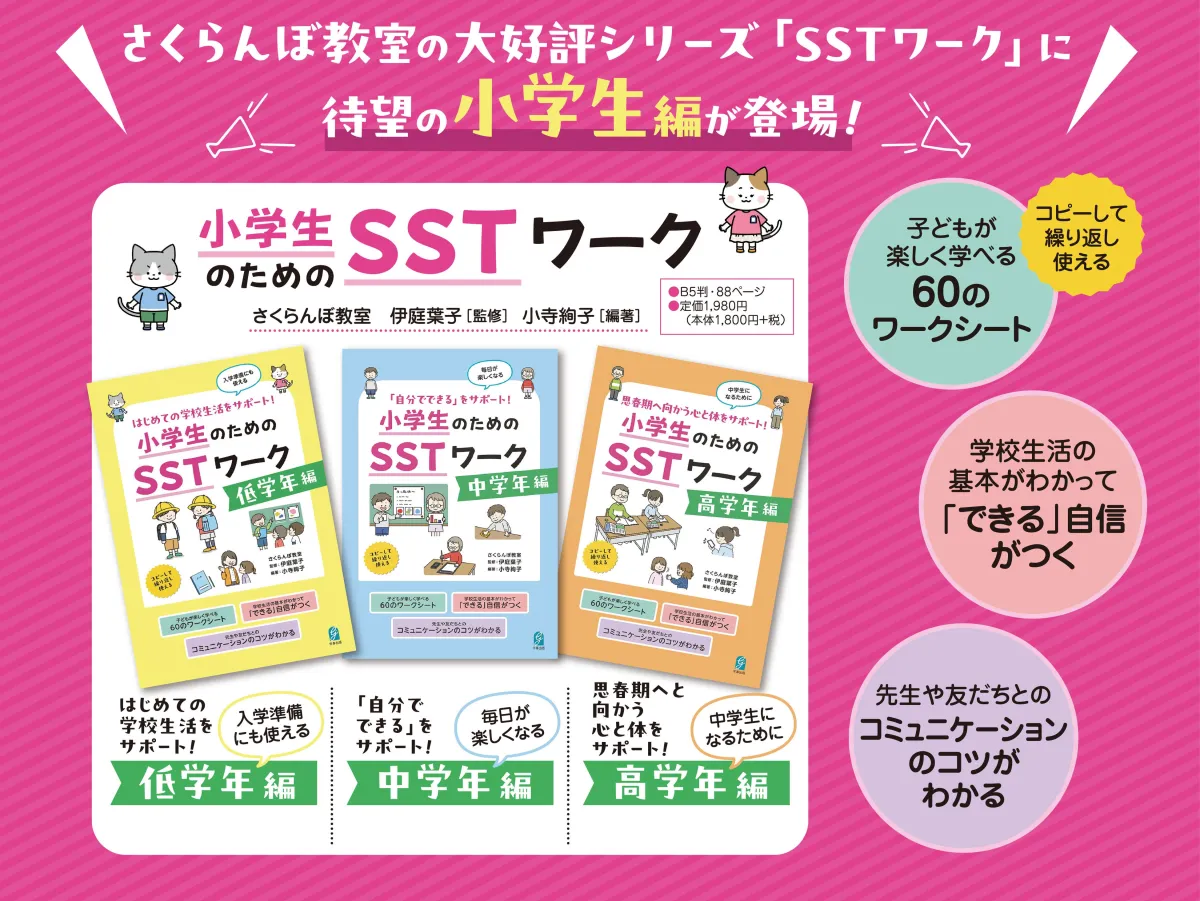 特別支援教育において長年の実績を持つさくらんぼ教室が、待望の新シリーズ「小学生のためのSSTワーク」を発表しました。これにより、小学3・4年生向けの「中学年編」と、5・6年生向けの「高学年編」が同時刊行され、子どもたちの学校生活をより良いものへとサポートします。