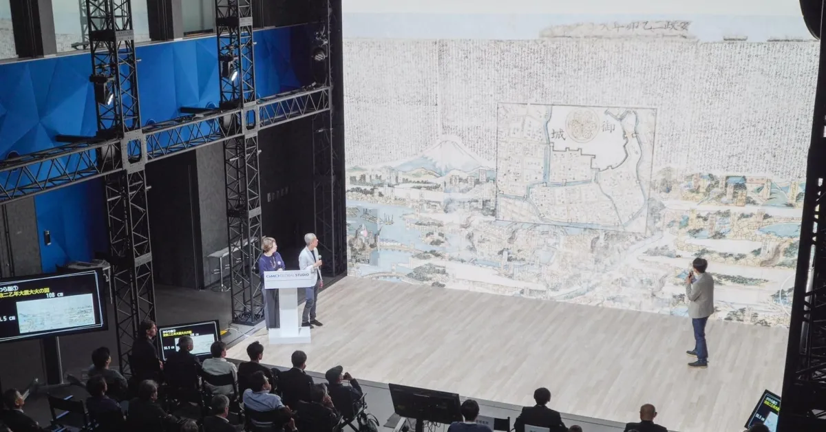 江戸時代の地震に関する歴史資料が、東京大学地震研究所の監修のもと、8K映像で展示されました。古地図やナマズ絵が大画面に映し出され、来場者は当時の社会背景や被災状況をリアルに体感しました。