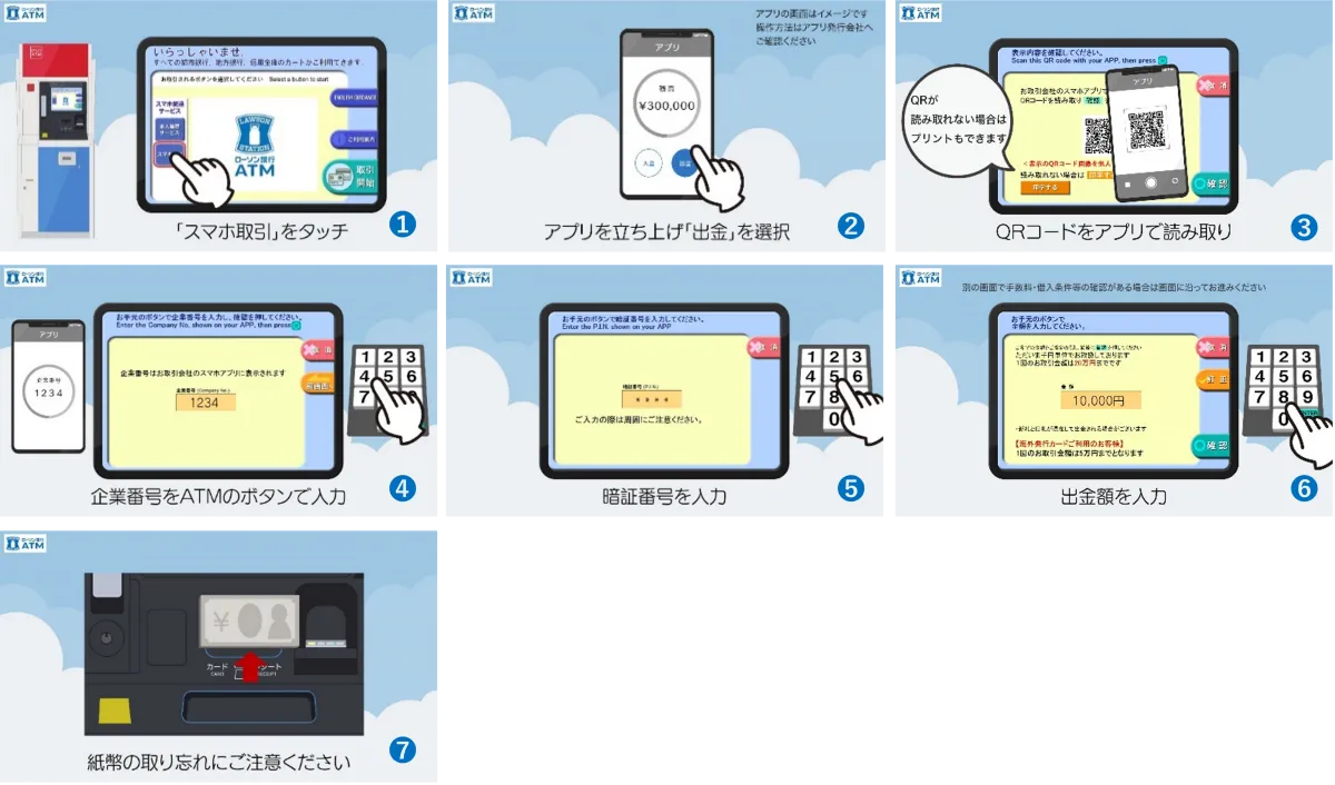 この「スマホATM」サービスでは、お客さまが事前に楽天銀行のアプリをインストールし登録することで、ローソン銀行のATMで表示されるQRコードを読み取ることで、現金の引き出しや預け入れが行えるようになります。全国に配置された約14,000台のローソン銀行ATMでこの便利なサービスが利用できることで、これまで以上にお客さまの利便性が向上します。