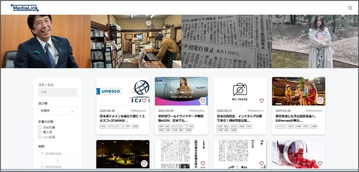 「MediaLink」は、全国の新聞、雑誌、情報誌、Webメディアなどが参加するクローズドサイトです。これにより、各メディア企業は登録した記事やコンテンツを他社の媒体に掲載し、より多くの読者に届けることが可能になります。また、参加企業はメールマガジンで新着情報を受け取ることができ、興味のあるコンテンツを簡単に見つけて、自社媒体に取り入れることができます。