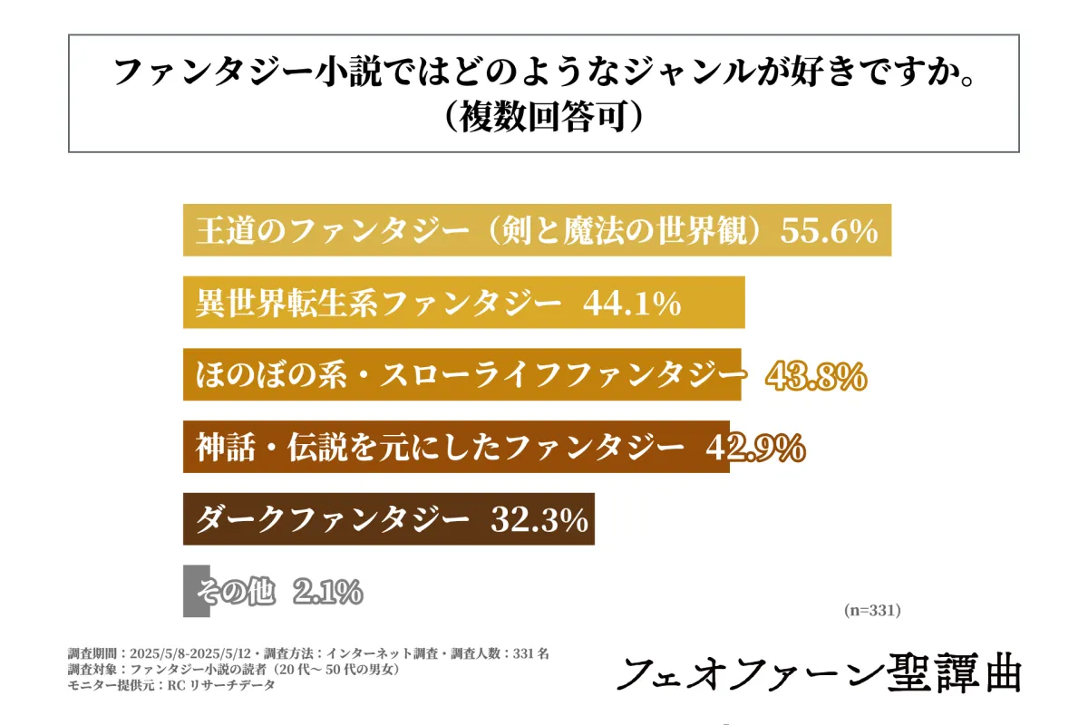 さらに、ファンタジー小説の中で特に人気を集めているジャンルについても調査しました。その結果、最も支持されたのは「王道のファンタジー(剣と魔法の世界観)」で、55.6%の読者がこのジャンルを好んでいます。次に「異世界転生系ファンタジー」が44.1%、そして「ほのぼの系・スローライフファンタジー」が43.8%で続きました。王道のファンタジーが読者を魅了しているのは、「冒険」や「エピックな戦い」といった要素が多いからでしょう。