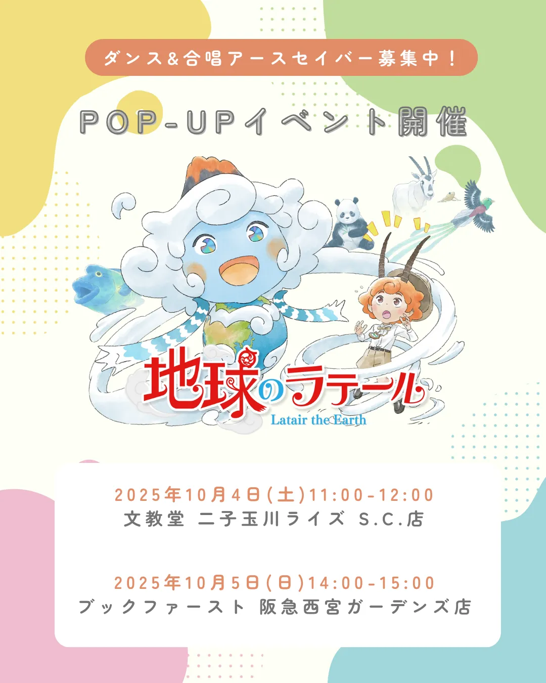 子どもたちの未来を考えた教育アニメ『地球のラテール』のPOP-UPイベントが、東京と関西の書店で開催されます。開催される場所は、文教堂 二子玉川ライズ S.C.店(東京)とブックファースト阪急西宮ガーデンズ店(関西)です。このイベントでは、親子で楽しめる様々なプログラムが用意されています。