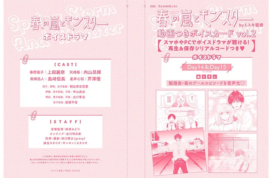 待望のボイスドラマふろく第2弾「春の嵐とモンスター」が、2月20日(木)に発売される『花とゆめ』の6号で登場しました。今回のふろくには、イラストが描き下ろされた「春の嵐とモンスター動画つきボイスカードvol.2 by ミユキ蜜蜂」が含まれています。前回好評だったボイスドラマがさらにパワーアップして帰ってきました!