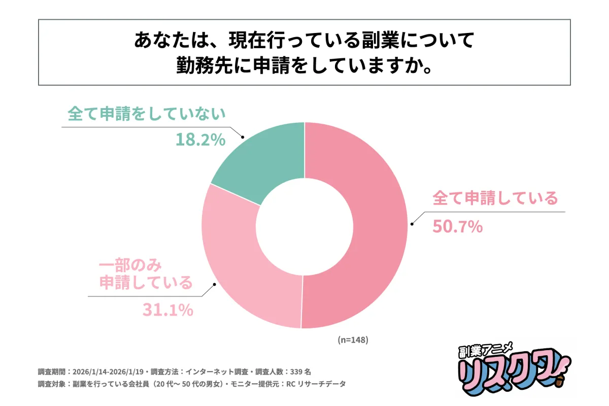 副業を行う際は「勤務先への申請が必要」と認識している会社員は、全体の50.9%に達しており、さらにこの中で約半数が一部または全ての副業を申請していないという結果も浮かび上がった。主な理由としては、「申請をすると却下される可能性」や「手続きが面倒」という意見が多く、企業における制度設計の重要性が改めて浮き彫りになっている。