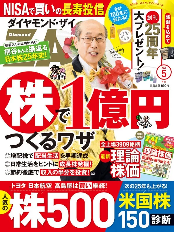 株式会社ダイヤモンド社が発行する月刊マネー誌『ダイヤモンドZAi(ザイ)』は、2025年5月号をもって創刊25周年を迎えます。この記念すべき号は、優待投資家として名高い桐谷広人さんとの特集「日本株25年史」を掲載し、四半世紀にわたる日本の株式市場の歴史を振り返ります。また、桐谷さんが推薦する株主優待品のプレゼント企画も予定されており、ファン必見の内容となっています。
