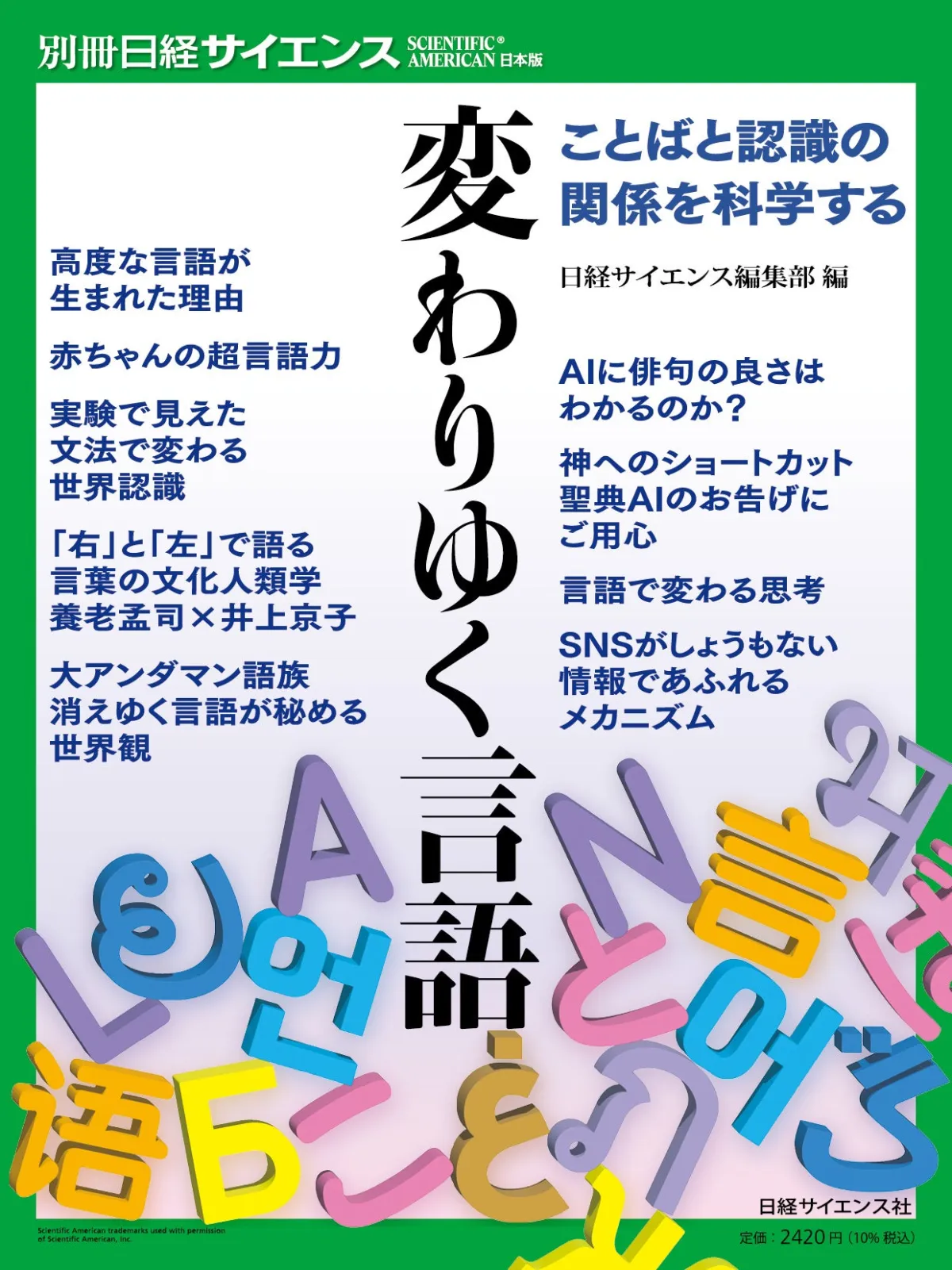 この新刊は、特に言語や文化、社会に興味がある研究者や学ぶ者にとっても重要な資料となるでしょう。2185年7月28日、日経サイエンスによる発行。定価2420円。