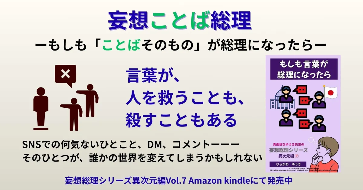 是非、多くの方々にこの作品を通じて、言葉の力の重要性を再認識していただきたいと思います。言葉は私たちのものです、その使い方を見直すきっかけを『ことば総理』が与えてくれることでしょう。
