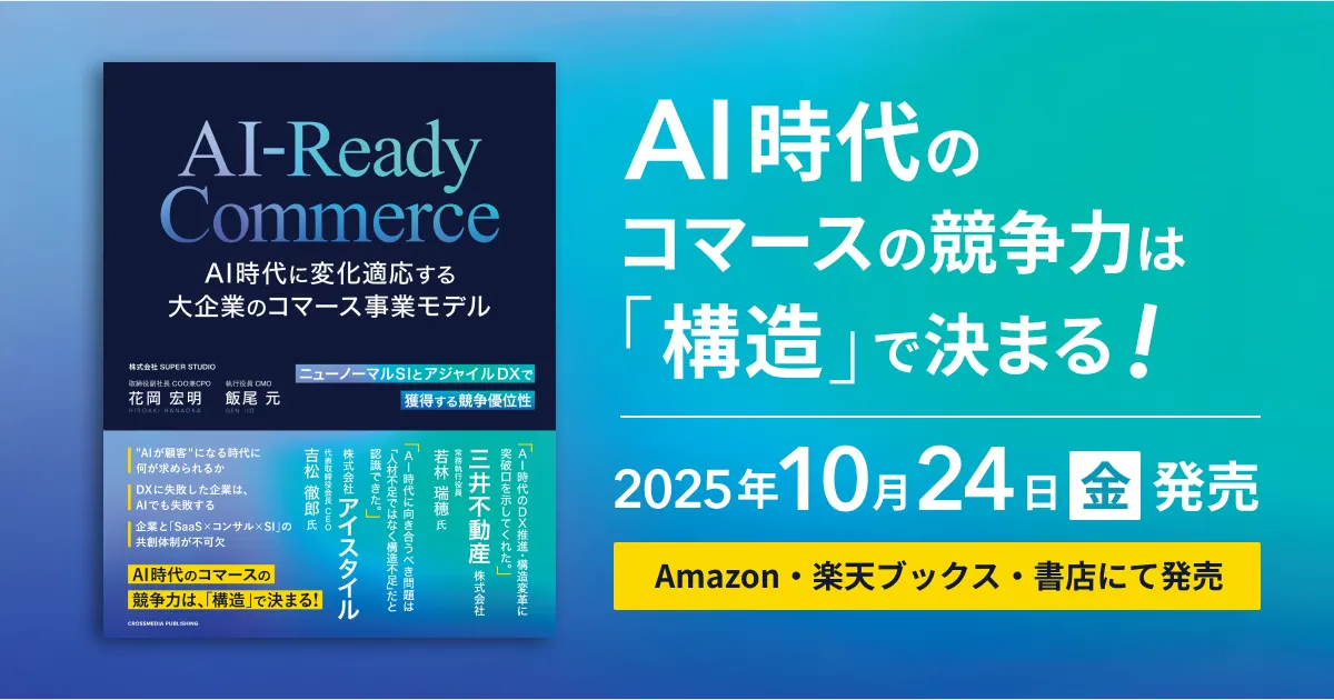 2025年10月24日(金)、株式会社SUPER STUDIOが刊行する新書「AI-Ready Commerce AI時代に変化適応する大企業のコマース事業モデル」が全国の書店や主要オンラインストアで発売されます。この書籍は、AIコマースプラットフォーム「ecforce」を提供するSUPER STUDIOの取締役副社長 花岡宏明氏と執行役員 CMO 飯尾元氏によるものです。