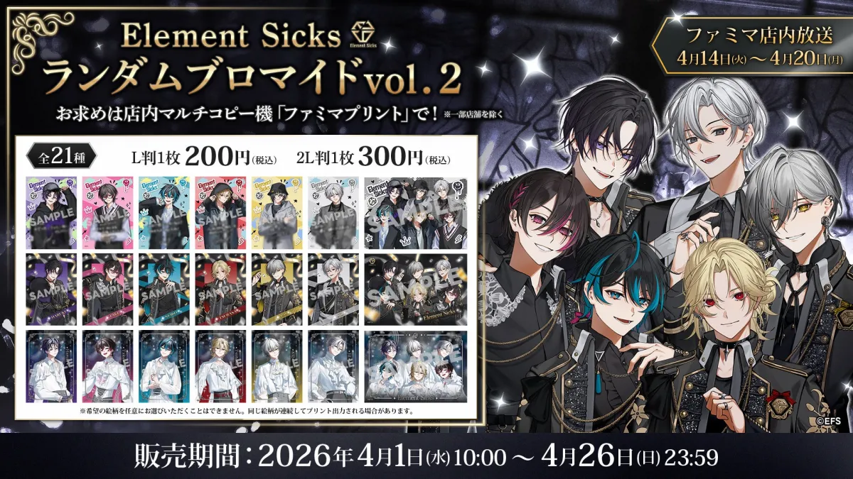 2026年4月1日(水)10:00、全国のファミリーマート店内のマルチコピー機サービス「ファミマプリント」に、歌い手グループ『Element Sicks』の新しいランダムブロマイド第二弾が発売されます。この新作は、第一弾が好評だったことを受け、ファン待望の再登場。メンバーたちの描き下ろしイラストに、手書きのメッセージが添えられた特別仕様のブロマイドが全21種類揃っています。