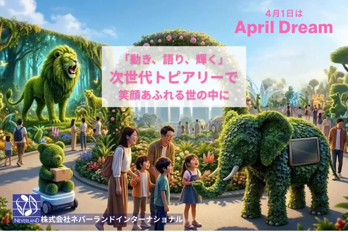 時代とともに変化するニーズに応える形で、トピアリーは「装飾」から「体験」へと進化してきました。ネバーランドインターナショナルが目指すのは、テクノロジーと植物が共存し、人々に夢中になれる場所を作り出すことです。その先には、大人も子どもも笑顔あふれる世界が広がっています。