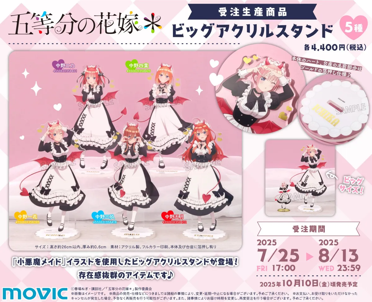 人気マンガ『五等分の花嫁*』のビッグアクリルスタンドが、受注生産の形で登場します。春場ねぎ先生の作品は、連載を通じてシリーズ累計2000万部以上を誇り、2019年にはTVアニメとして放送されました。その後も第二期や劇場版、さらには新たなTVスペシャルが制作されるなど、作品の魅力がますます広がっています。2025年9月18日にはコンシューマゲームの新作『五等分のプリンセス ~幻想と深淵と魔法学院~』のリリースも控えており、ファンにはたまらない状況が続いています。