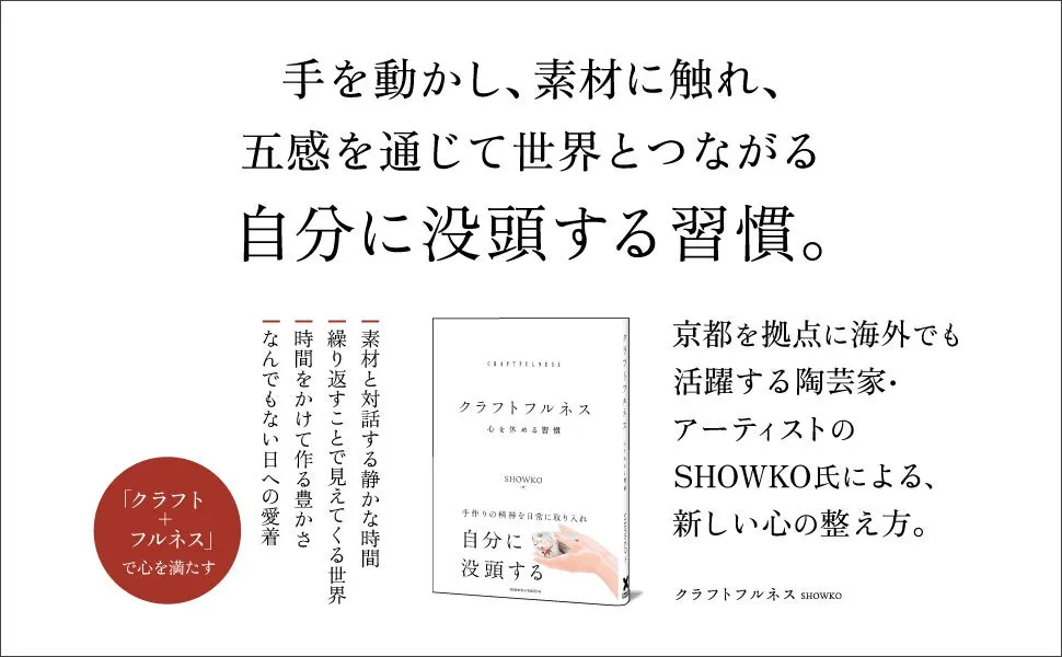 SHOWKO氏は、陶芸家の家系に生まれ、340年の歴史を持つ「真葛焼」で育ちました。手仕事の大切さを実感してきた彼が本書で伝えたいのは、ものを作る時間は単なる生産活動ではなく、自分と向き合う大切な時間であるということです。効率が重視される時代ではありますが、本書では「結果よりも過程に目を向ける時間」の価値が強調されています。