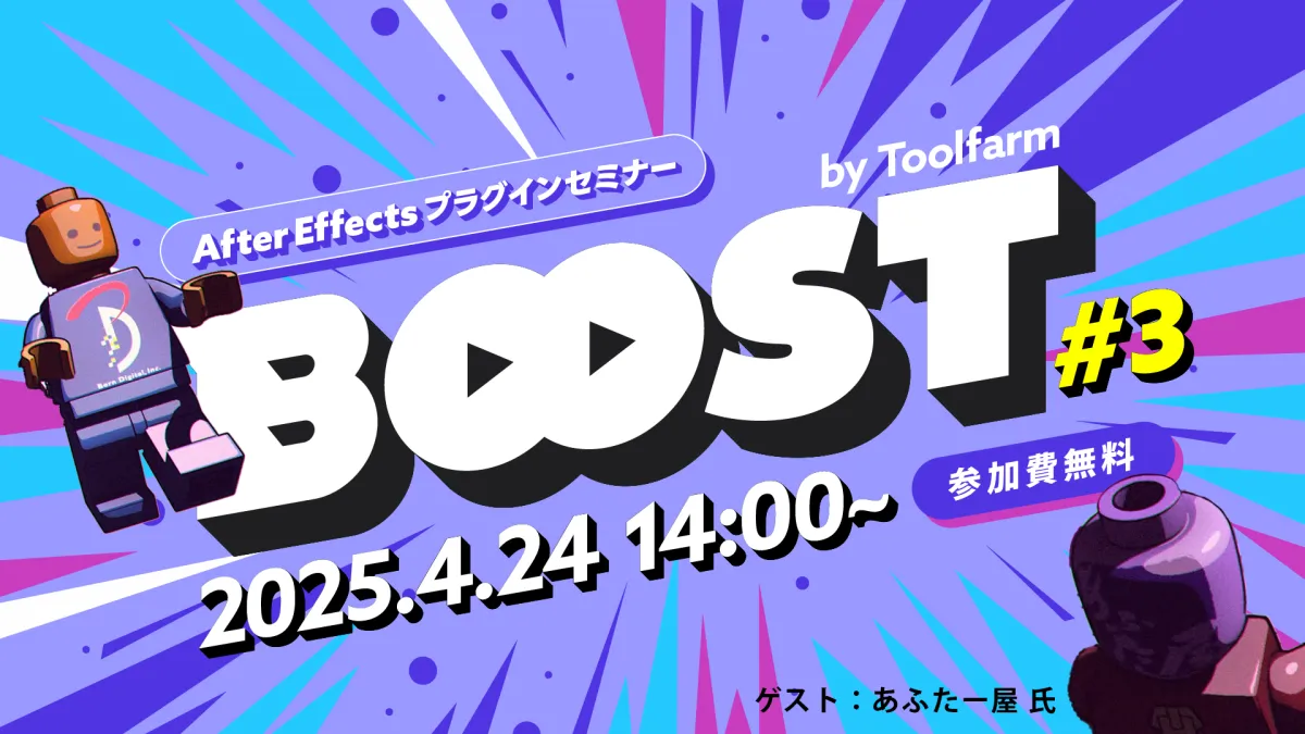 株式会社ボーンデジタルは、2025年4月24日(火)にオンラインセミナー「Boost!by Toolfarm」の第3回を開催します。このセミナーは、After Effectsを用いたクリエイティブな映像制作に興味がある方を対象としたもので、特に広告やプロモーション映像に特化した内容になっています。