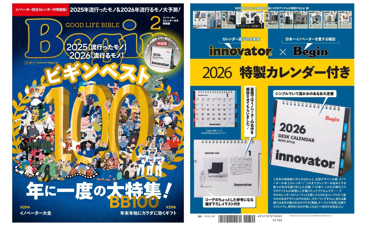 株式会社世界文化社から、人気ブランド「イノベーター」とのコラボ商品、『Begin 2026年2月号 イノベーターカレンダー付き 特装版』が、2025年12月22日に発売されることが発表されました。この特装版は、イノベーター特製の卓上カレンダーが同梱される限定商品で、特に注目の発表です。