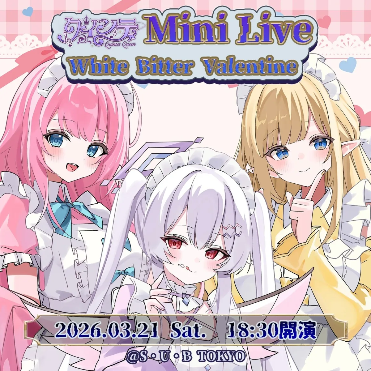 2026年3月21日、中野のS.U.B TOKYOで「クインテ Mini Live ~ White Bitter Valentine ~」と題したオフラインライブが行われます。このイベントは、アイドルVTuberグループ「クインテ」が3人体制に移行して初めてのお披露目となる重要なイベントです。