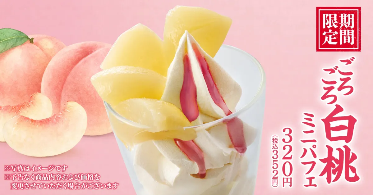 「ごろごろ白桃ミニパフェ」は、320円(税込352円)で販売され、食後のデザートとしての存在感を放ちます。その名の通り、ごろっとした白桃の果肉がパフェの中にたっぷりと盛り込まれており、見た目にも楽しい一品です。白桃の甘みとジューシーな食感が、クリーミーなソフトクリームと絶妙に絡み合い、思わずもう一口、また一口と誘惑されてしまうことでしょう。