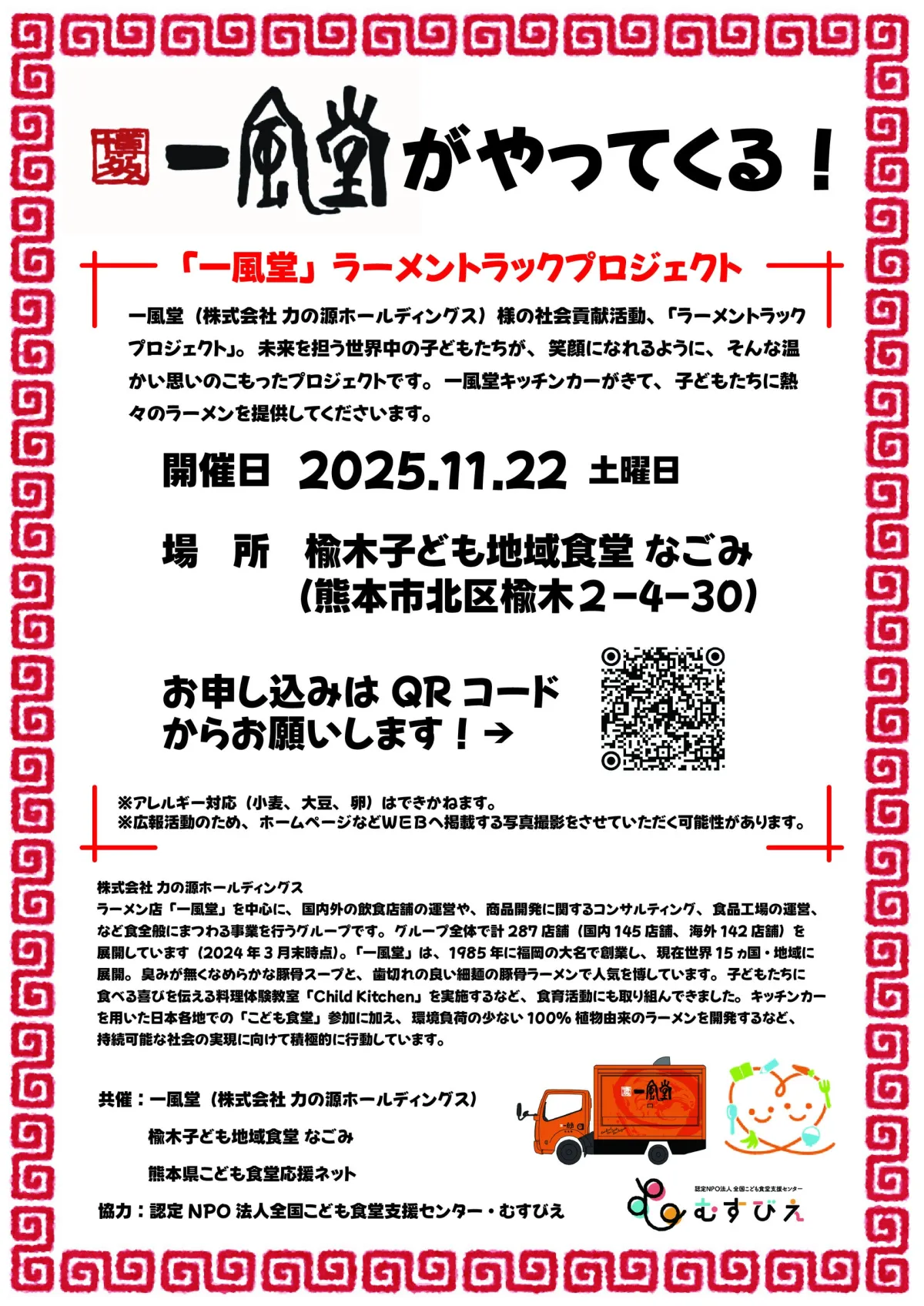 2025年11月22日、熊本市の楡木子ども地域食堂「なごみ」で、特別なイベントが行われます。それは、一風堂が主催する「ラーメントラックプロジェクト」です。これは、子どもたちに温かいラーメンを提供するという社会貢献活動の一環で、多くの協力団体と共に実現しました。