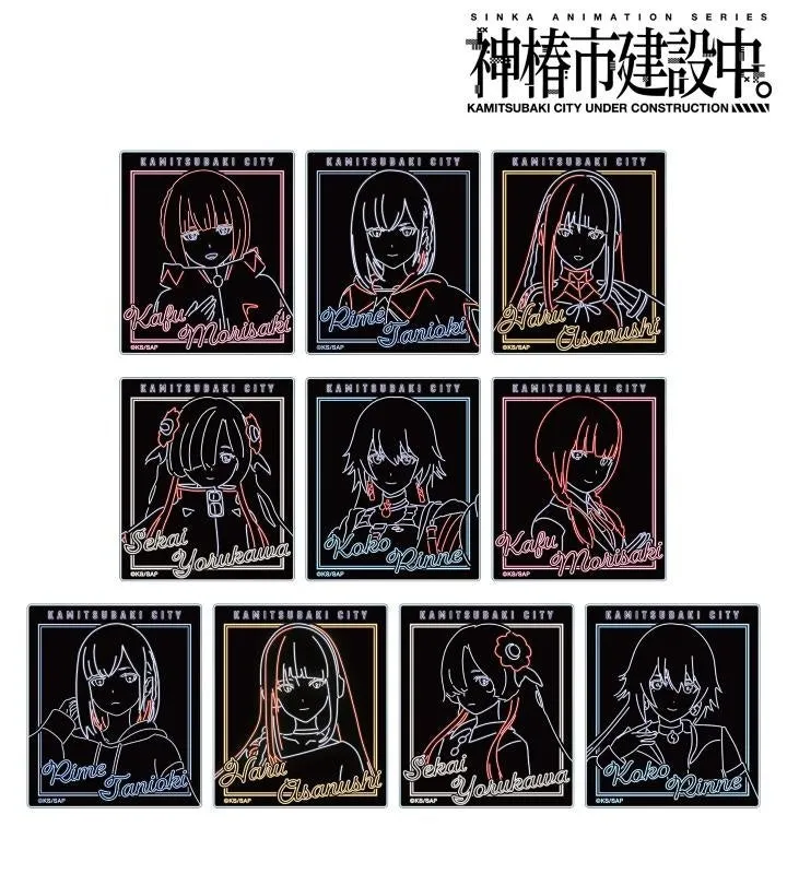 このアクリルカードシリーズは、アニメの主要キャラクターたちをネオンカラーで表現。森先 化歩、谷置 狸眼、朝主 派流、夜河 世界、輪廻 此処のイラストが強烈な印象を与えます。デスクやお部屋に飾ることで、毎日を彩るおしゃれなインテリアアイテムになります。