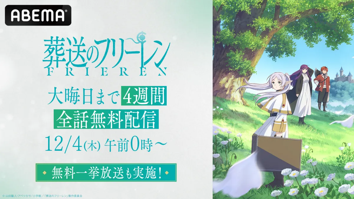 新しいテレビの形を提供する「ABEMA」で、人気アニメ『葬送のフリーレン』の第1期全28話が無料で楽しめるチャンスがやってきました。この無料一挙放送は2025年12月3日(水)からスタートし、4週間にわたって配信される予定です。