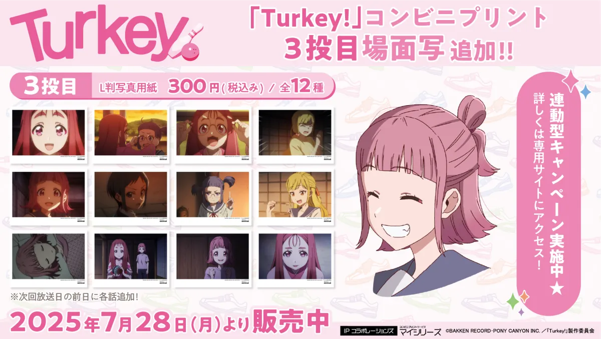 『Turkey!』コンビニプリントでは、毎週放送米終了後、次の話が放送される前日までに厳選された12点の「場面写」をL判写真用紙でプリントできるサービスを提供しています。他にも、各キャラクターをデザインしたシールや、ポスター、ブロマイドのプリントも楽しめます。これで、アニメの美しいビジュアルを手元にコレクションすることができます。
