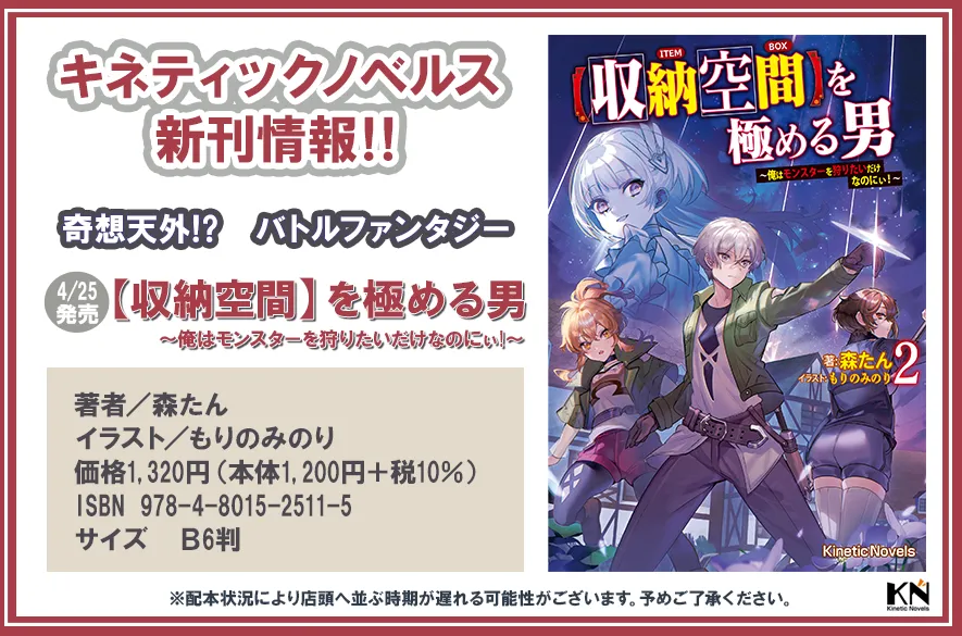 本日、キネティックノベルスより新刊『【収納空間】を極める男2~俺はモンスターを狩りたいだけなのにぃ!~』が発売されました。発売日は2025年4月25日(金)で、全国の書店で手に入れることができます。この新刊は、第4回キネティックノベル大賞で優秀賞を受賞した作品の続編で、物語はますます盛り上がりを見せています。