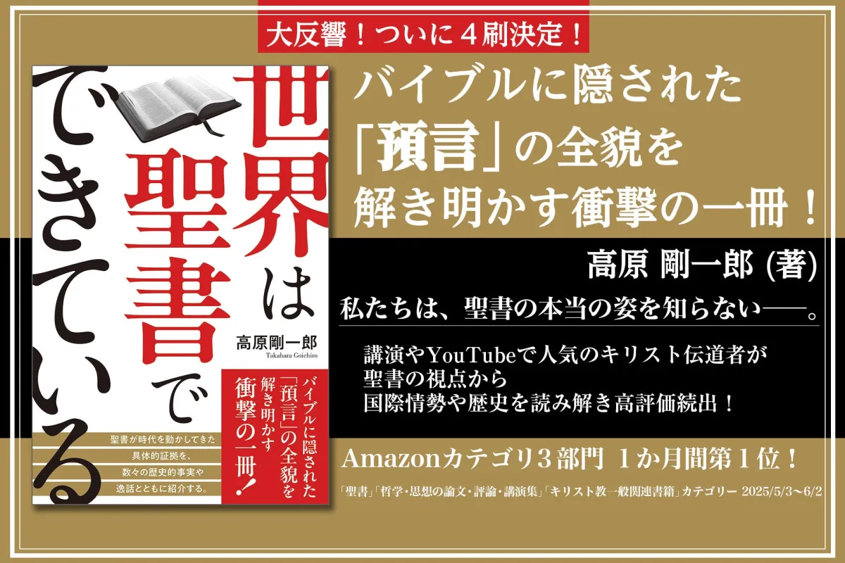 人気キリスト伝道者の高原剛一郎を著者に持つ書籍『世界は聖書でできている』が、ついに4刷の重版が決まり、累計販売部数が22,000部を突破しました。この本は、聖書を通じて国際情勢や歴史を分析し、読み解く新たな視点を提供する一冊です。高原氏の講演活動やYouTubeでの人気は、この書籍の内容に基づいています。