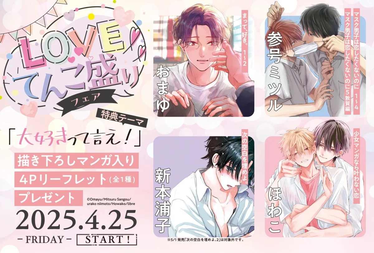 4月25日(金)、全国の書店で「♡LOVEてんこ盛り♡フェア」が開催されます。このイベントは、BLや少女マンガを愛するファン必見の企画で、参加書店で対象商品を購入した方には、特典として描き下ろしマンガ入りの4ページリーフレットがプレゼントされます。特典は数量に限りがあるため、早めの来店をおすすめします。