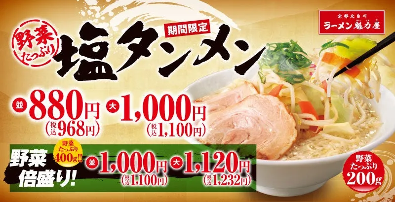 「野菜たっぷり塩タンメン」は、並が880円(税込968円)、大が1,000円(税込1,100円)。さらに、野菜倍盛りは並が1,000円(税込1,100円)、大が1,120円(税込1,232円)で提供されます。販売は全店舗で行っており、一部店舗を除いて広くアクセス可能です。販売期間は2025年1月22日から類似商品が無くなり次第終了となりますので、早めの訪問をお勧めします。