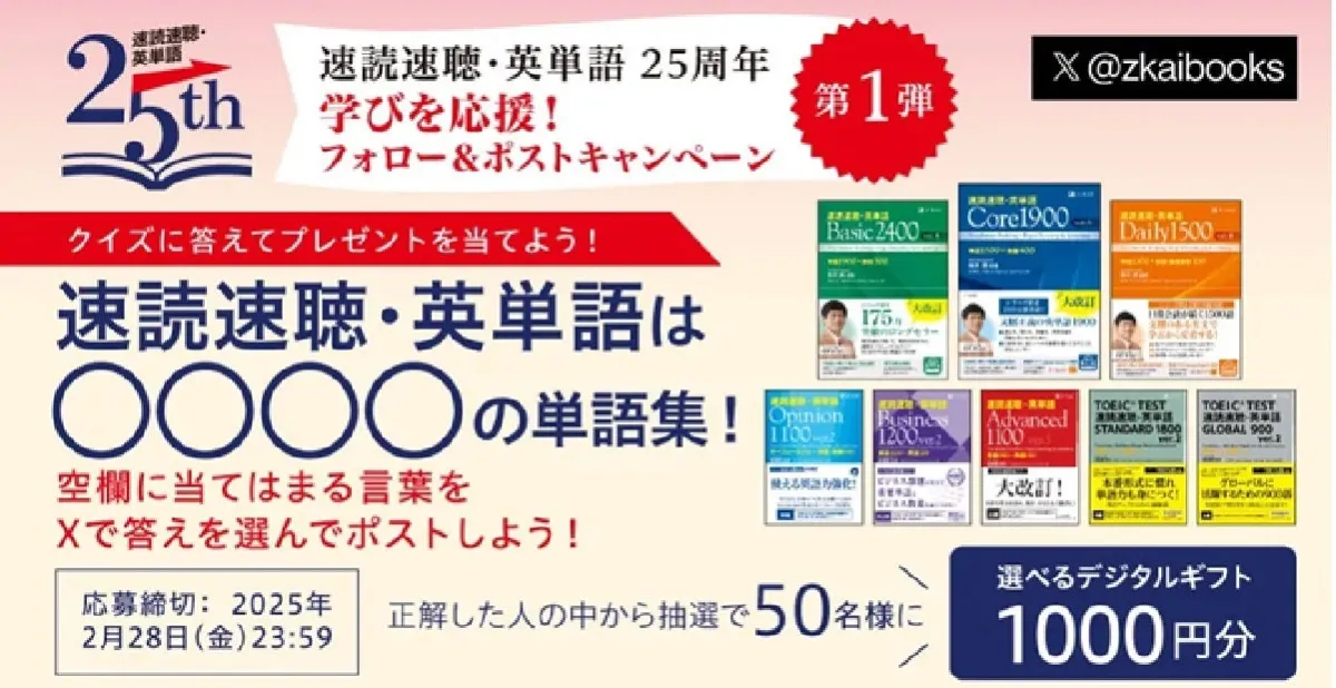 株式会社増進会ホールディングスのグループ企業である株式会社Z会ソリューションズが、英単語教材「速読速聴・英単語」シリーズの発刊25周年を記念した特別なキャンペーンを始めました。来たる2025年2月3日から開催されるこのキャンペーンでは、クイズに正解した参加者の中から選ばれた50名様に、選べるデジタルギフト1000円分がプレゼントされます。英語学習を続ける皆様を全力で応援するこの機会をお見逃しなく!