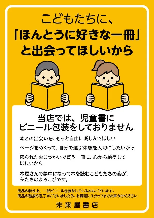 株式会社未来屋書店(本社:千葉県千葉市、代表取締役社長:平川雅隆)が、2025年10月1日より全国205店舗で児童書のシュリンクパックを全面的に廃止することを発表しました。この取り組みは、こどもたちに「ほんとうに好きな一冊」と出会ってほしいという願いから生まれました。