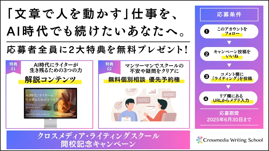 株式会社クロスメディア・パブリッシングは、2025年6月23日より、AI時代に求められるライティングスキルを学ぶことができる「クロスメディア・ライティングスクール」をスタートします。このスクールでは、ライター志望者や業界で活躍したい方々に向けて、実践的なノウハウを提供し、AI技術を活用した新しいライティングの在り方を模索していきます。