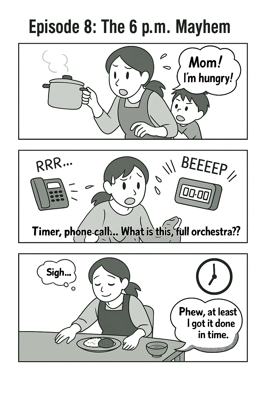 本書のエピソード「Episode 8 – The 6 p.m. Mayhem」では、昼間の保育所送迎や習い事が終わり、一日の忙しさがピークに達する夕方の風景が描かれています。「お腹すいた!」という子どもたちの声に駆られながら、母親は料理や洗濯、入浴とマルチタスクをこなさなければなりません。そんな日常の合間に、母親が「今日もよく頑張った」と自分を褒めるシーンは、多くのママにとっての共感ポイントです。