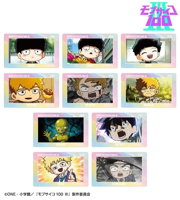 特徴:影山茂夫や霊幻新隆、エクボなどの印象的なシーンをデフォルメし、オーロラカードの形状で仕上げたステッカーです。スーツケースやPCなど、身近なアイテムのデコレーションに最適です。