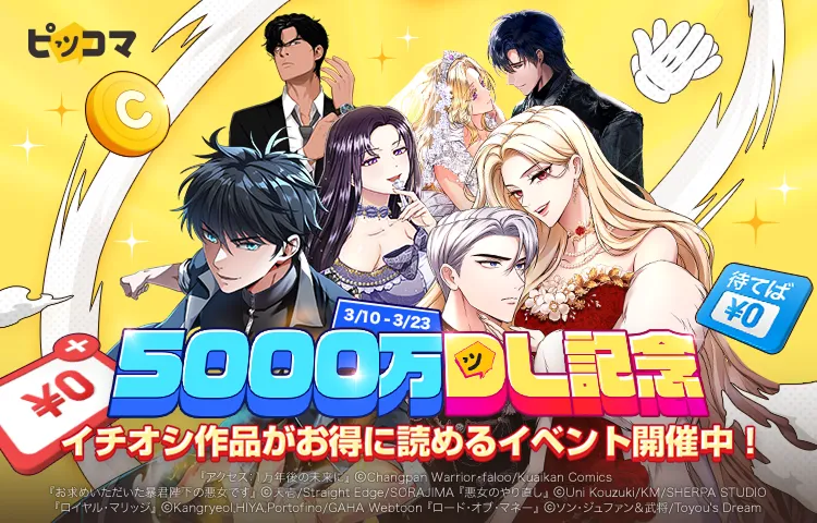 株式会社カカオピッコマ(東京都港区、代表取締役社長:金在龍)が運営する電子マンガ・ノベルサービス『ピッコマ』。この度、利用者の皆様への感謝の気持ちを込めて、5000万ダウンロードを記念した特別イベントを開催しています。このイベントは、3月10日から3月23日までの期間中、数多くの作品が超おトクに楽しめるというものです。