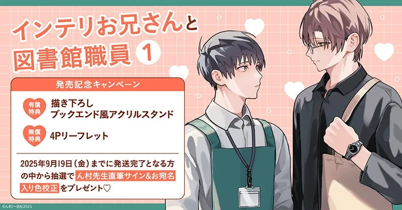 株式会社TORICOが運営するオンライン書店、ホーリンラブブックスにて、人気漫画家ん村先生の新刊『インテリお兄さんと図書館職員(1)』の発売を祝い、特別なキャンペーンがスタートしました。このキャンペーンでは、対象商品を購入した方の中から抽選で、ん村先生の直筆サインとお宛名入りの色校正がプレゼントされます。