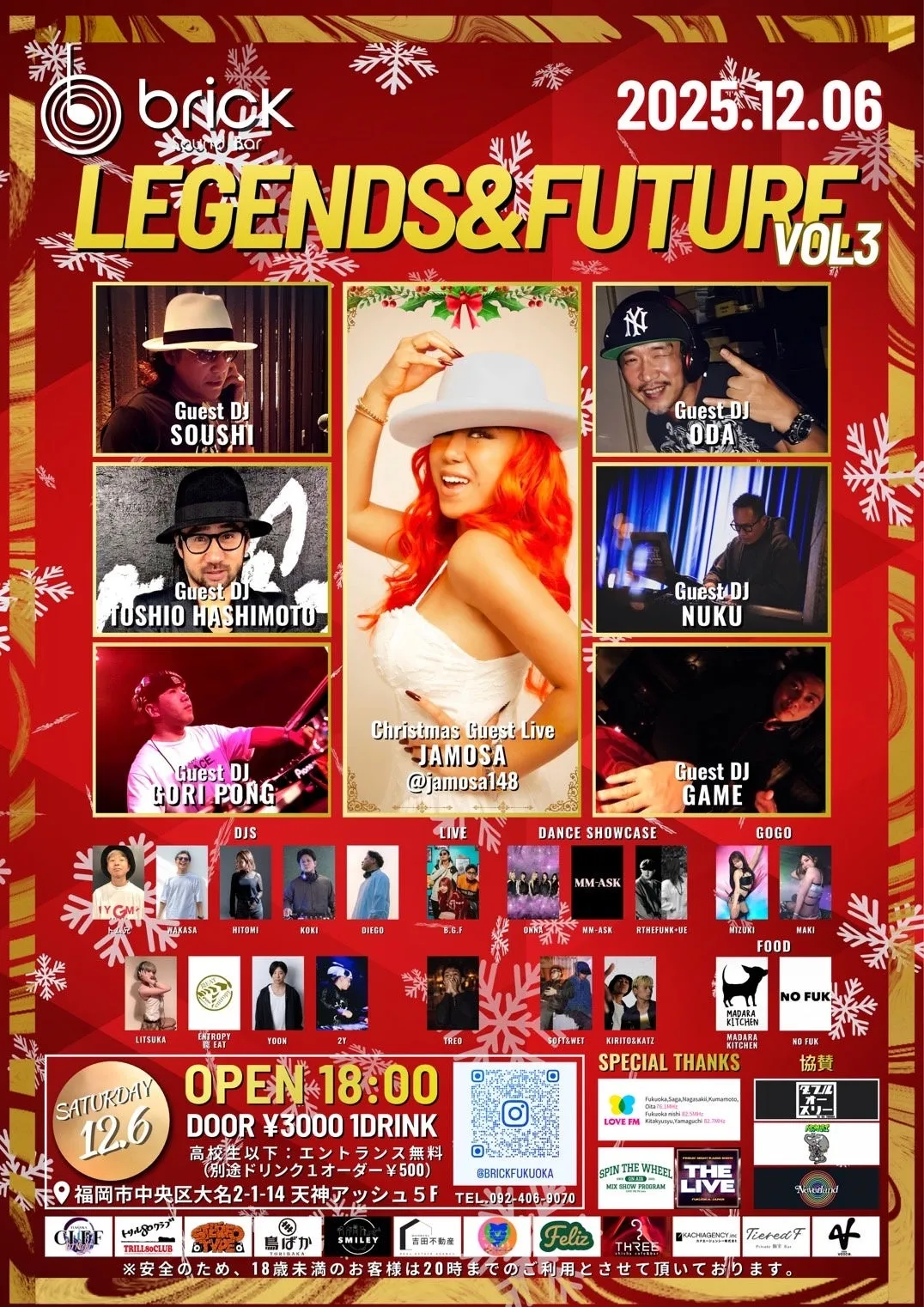福岡・天神大名の「Sound Bar BRICK」で、2025年12月6日(土)に「LEGENDS & FUTURE VOL.3 – JAMOSA Christmas Live」が開催されます。このスペシャルイベントは、クリスマスシーズンを彩る一夜となり、福岡の音楽シーンに名を馳せるレジェンドDJたちと次世代アーティストが織り成す特別な空間を提供します。