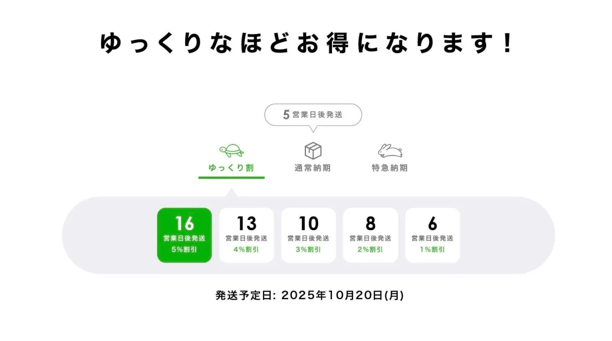 「ゆっくり割」は、その名の通り、納期に余裕を持ってご注文いただくほど、割引率が高くなる仕組みです。これにより、納期を選ぶだけで自動的に割引が適用されるため、煩わしい手続きは一切ありません。また、生産ラインの稼働を平準化することで、急な納期短縮によるコスト上昇の問題も解消しました。こうした取り組みにより、クリエイターや企業様は、制作スケジュールに余裕を持ちつつ、コストメリットが得られる理想的な環境が生まれました。