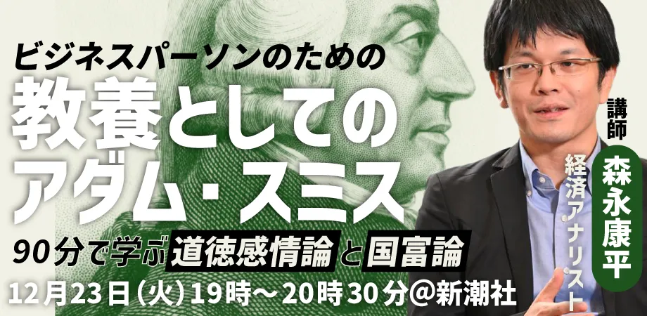 2025年12月23日(火)19時より、東京・神楽坂の新潮社にて、経済アナリストである森永康平氏を講師に迎え、「ビジネスパーソンのための教養としての『アダム・スミス』」として、特別講義が開かれます。これは、経済学の父として知られるアダム・スミスの著作『道徳感情論』および『国富論』を通じて、彼の思想を学び、ビジネスに活かす方法を探求するイベントです。