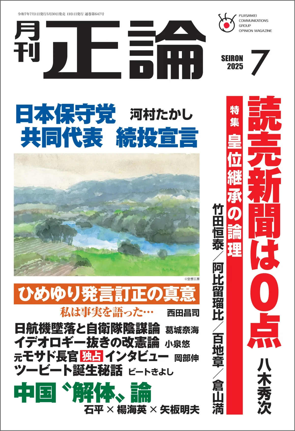 今月、月刊『正論』7月号が産経新聞社から発行されます。これは日本の針路を考える論壇誌として知られ、本号では特集「皇位継承の論理」が掲載されています。この特集は、読売新聞が女性宮家の創設や女性皇族に関する提言を行ったことに対する批判から始まっており、麗澤大学の八木秀次教授はその社説に対して「読売新聞は0点」と厳しい評価を下しています。