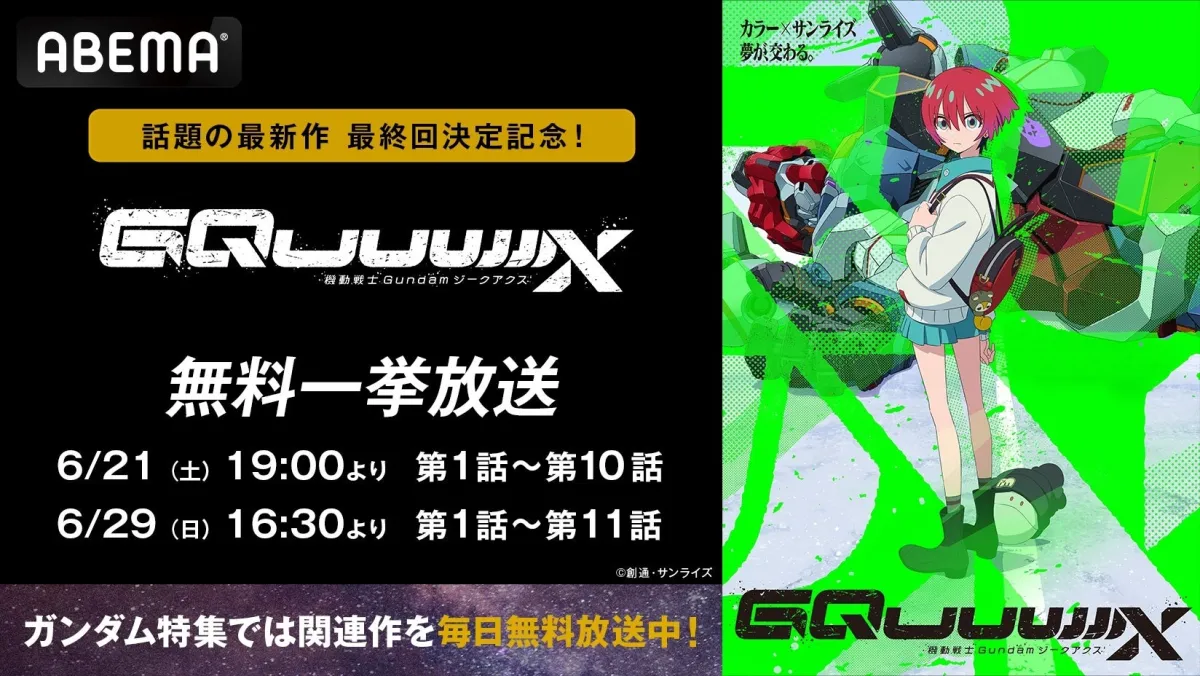 新たなガンダムプロジェクトが話題を集めている中、アニメ『機動戦士Gundam GQuuuuuuX(ジークアクス)』が6月21日(土)からABEMAにて、最終話直前の全話無料一挙放送を実施することが発表されました。この特別企画は、最新話までを2週にわたってお届けし、ファンには一大イベントとなります。